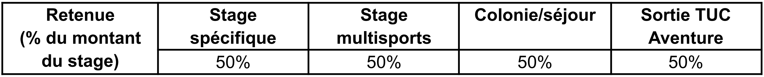 TUC Vacances et Formation s’engage à en informer les familles dans les meilleurs délais. TUC vacances et formation vous proposera dans la mesure du possible un stage ou une activité équivalente, à un coût comparable que vous serez libre d’accepter. Si vous choisissez une activité ou un stage plus cher, tout surcoût sera à votre charge. Si l’activité est moins chère, la différence de prix vous sera remboursée. En cas de refus de la proposition, TUC Vacances et Formation remboursera les sommes déjà versées sous forme d’avoir valable douze (12) mois. En dehors de ce remboursement, cette annulation n’ouvre droit à aucune indemnisation à quelque titre que ce soit. La durée des stages multisports est calculée en journées d’animation de huit (8) heures, celle des stages spécifiques en demi-journées de deux (2) heures. Ces durées ne prennent pas en compte les éventuels temps de transport. TUC Vacances et Formation peut être amené à modifier les conditions de transport pour des raisons indépendantes de sa volonté. Aucune modification ne pourra entraîner une quelconque indemnisation. Notre responsabilité ne saurait se substituer à celle des transporteurs.